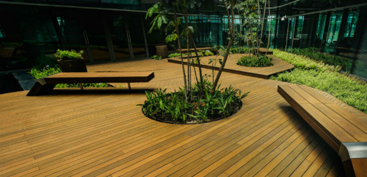 Hard wearing, heavy duty tropical hardwood from South America, Africa and Asia. Secret fastening clips instead of surface nails. Special deck oil to protect from UV rays, rain, and regular human traffic.