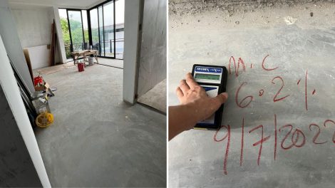 Pre-installation: cement screed sub-floor clean, dry and ready for timber installation (left); a measuring tool to ensure that the cement floor underneath has a low enough moisture level for timber installation (right)