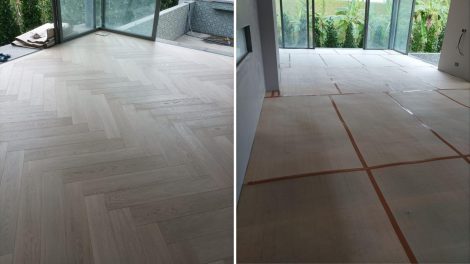 Post-installation of timber floor (left); temporary protection post-installation in the event that other works are not completed yet (right)